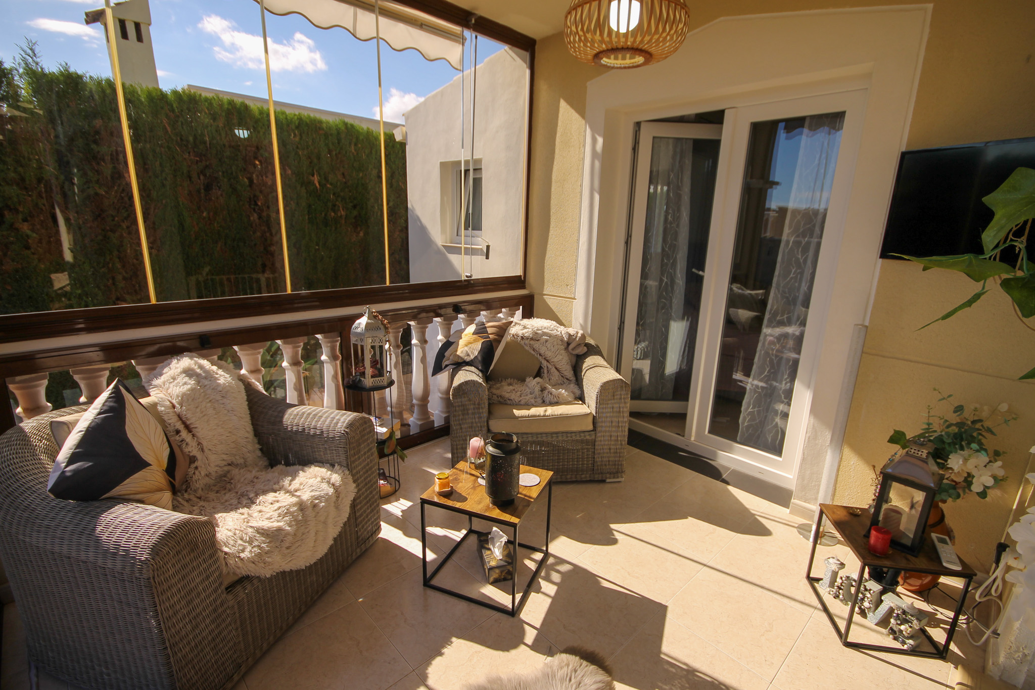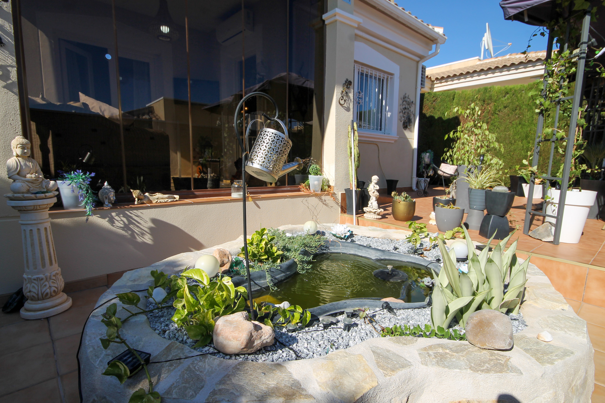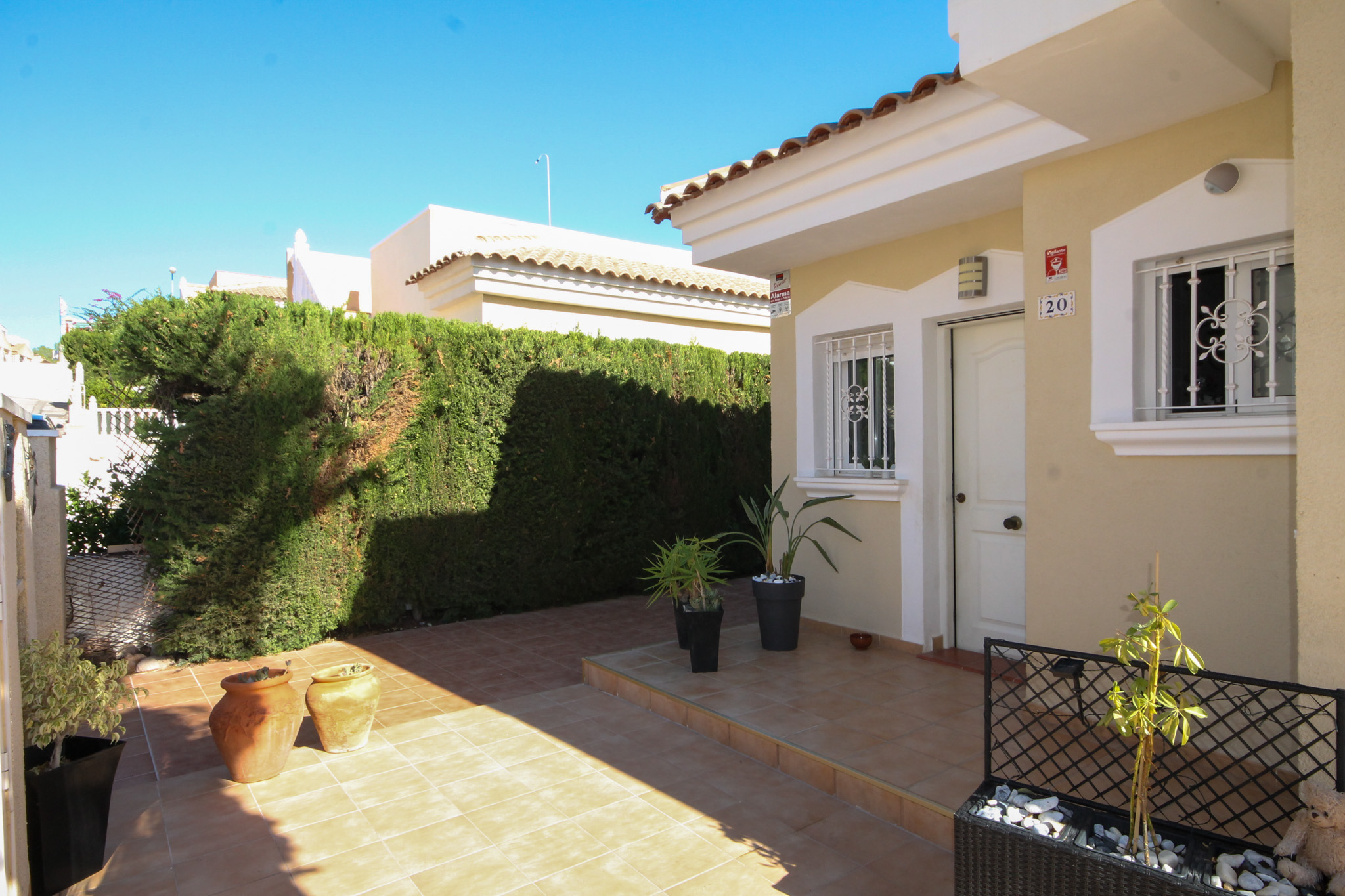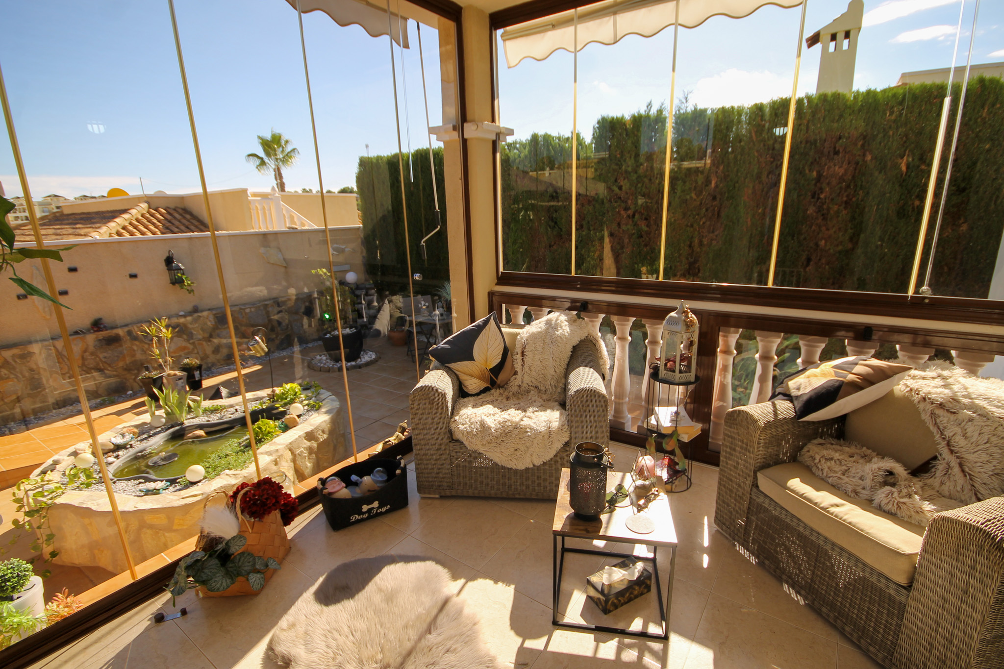 A door at the rear of the property enters into the fabulous modern kitchen with integrated appliances. This leads through to the light and spacious lounge diner with electric fireplace. The hall follows through to a family shower room and two double bedrooms, the master having an en-suite shower room. Accessed via the master bedroom or by the lounge there is a lovely enclosed terrace. The glass curtains open up fully to allow the outside in during hot days. This opens out into the private, south facing patio garden with its feature pond and seating areas. At the rear of the villa is also a utility room housing the boiler and washing machine, and also stairs which access the large roof solarium enjoying views across the urbanisation. The villa also benefits from off road parking, air conditioning, and 2 fabulous communal pools. The villa is tastefully furnished, and some of it is included in the sale. Situated in a quiet location, yet less than 5 minutes drive to all amenities. Viewing highly recommended.
