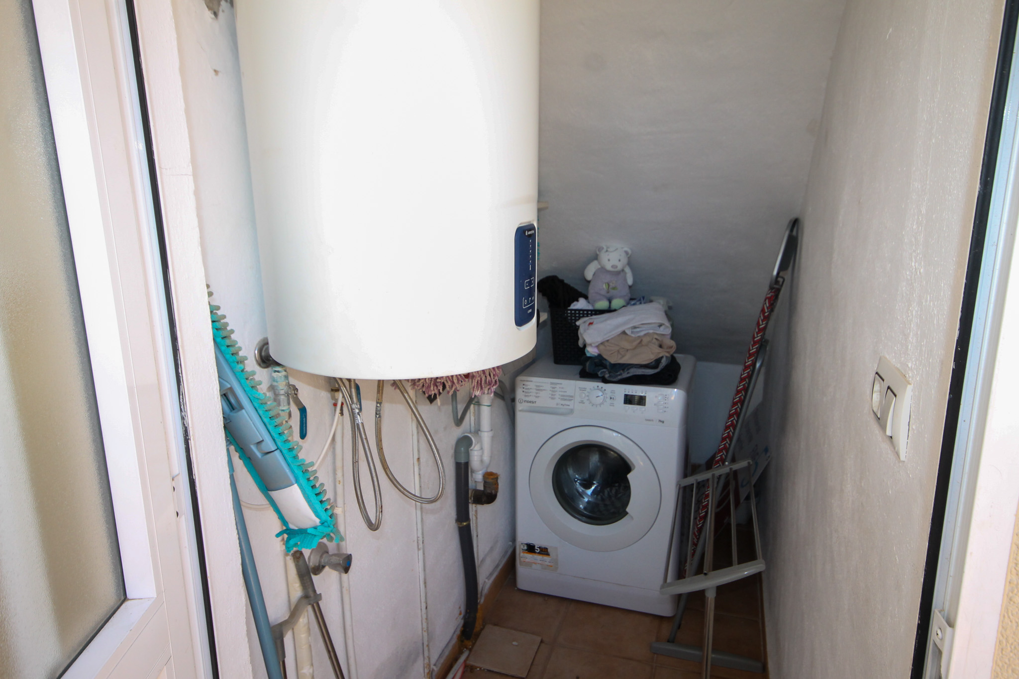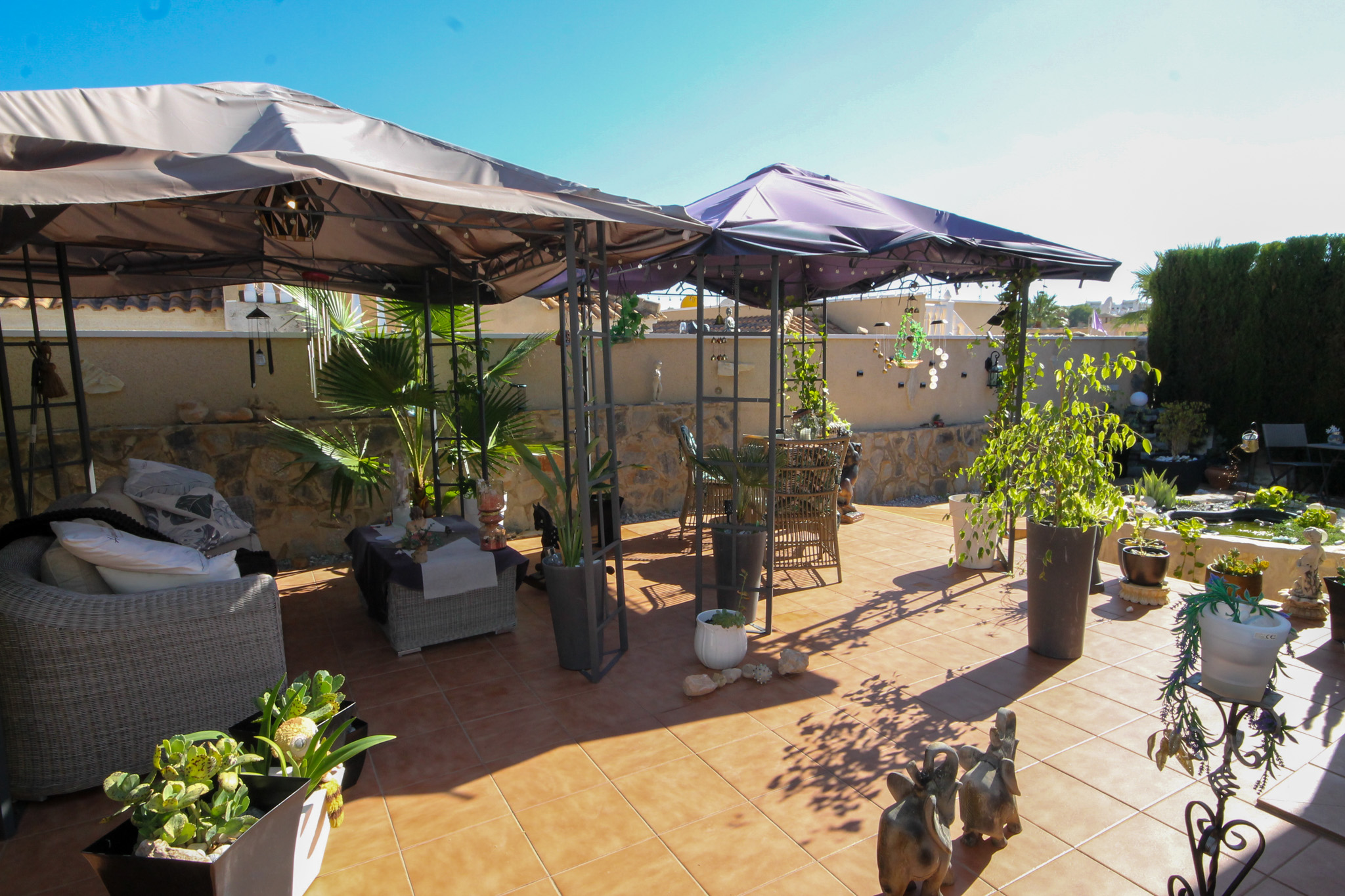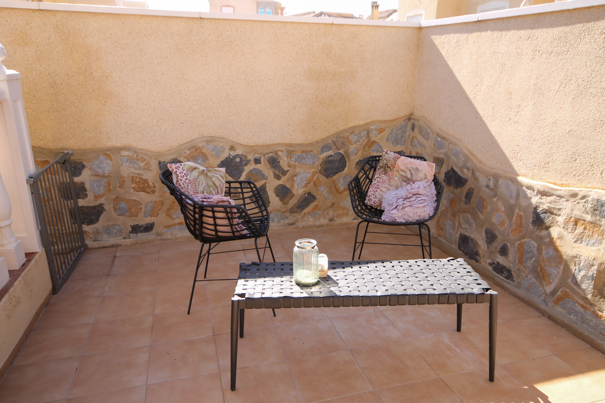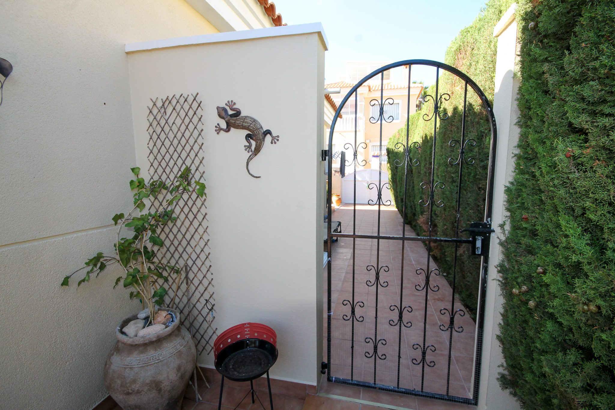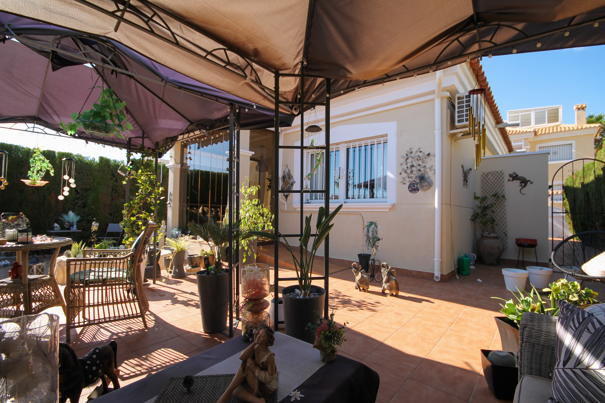 A door at the rear of the property enters into the fabulous modern kitchen with integrated appliances. This leads through to the light and spacious lounge diner with electric fireplace. The hall follows through to a family shower room and two double bedrooms, the master having an en-suite shower room. Accessed via the master bedroom or by the lounge there is a lovely enclosed terrace. The glass curtains open up fully to allow the outside in during hot days. This opens out into the private, south facing patio garden with its feature pond and seating areas. At the rear of the villa is also a utility room housing the boiler and washing machine, and also stairs which access the large roof solarium enjoying views across the urbanisation. The villa also benefits from off road parking, air conditioning, and 2 fabulous communal pools. The villa is tastefully furnished, and some of it is included in the sale. Situated in a quiet location, yet less than 5 minutes drive to all amenities. Viewing highly recommended.