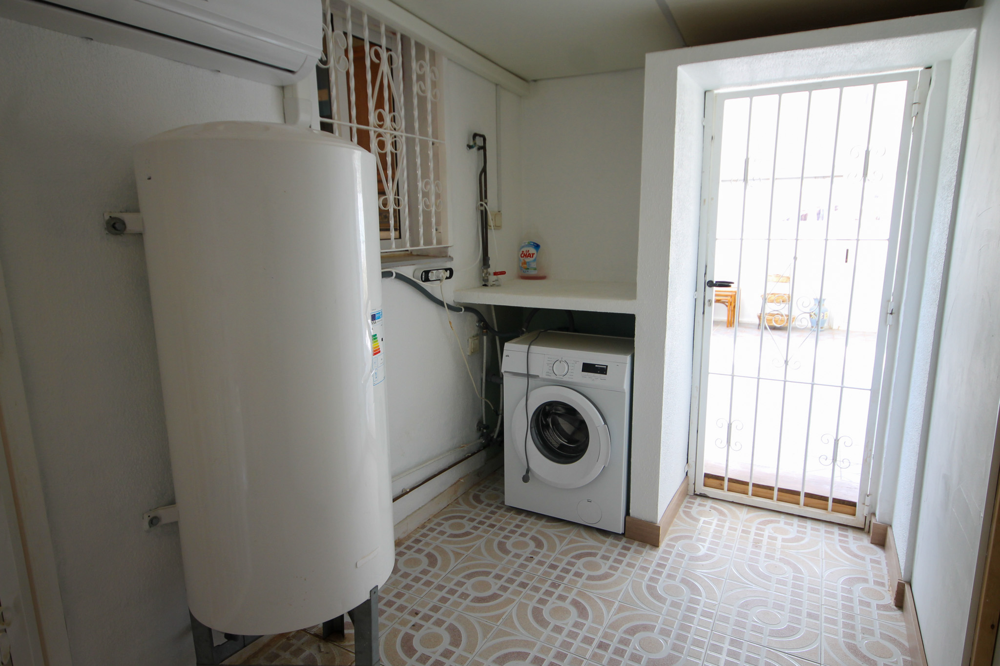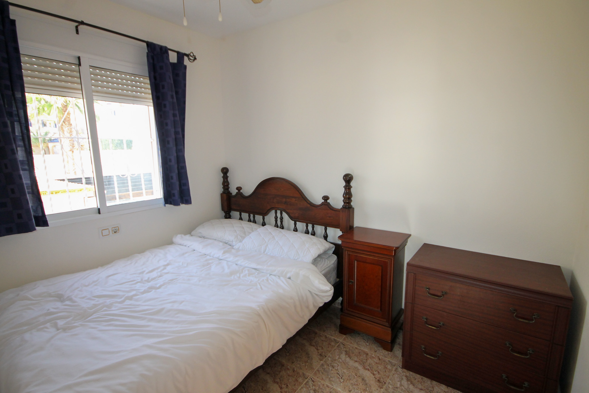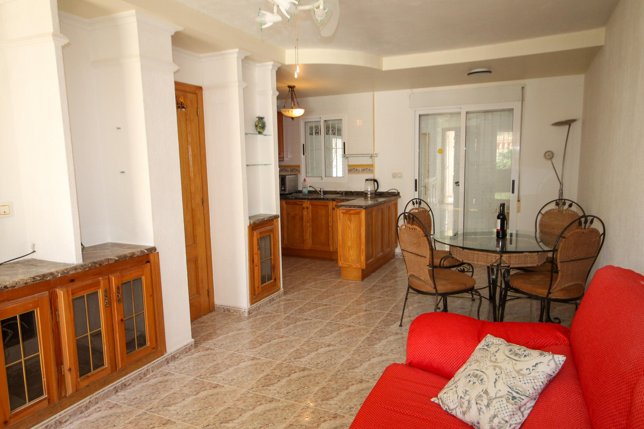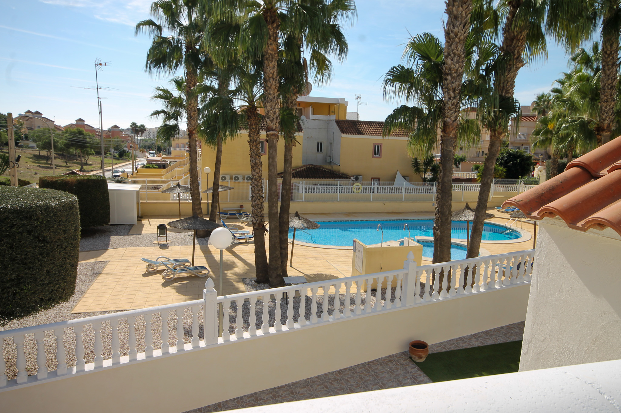 On the market for the first time since new, we offer this semi detached property on a large plot adjacent to the communal pool. This much loved family holiday home comprises of a sunny terrace into the lounge diner with W.C, and an open plan kitchen to the rear. Patio doors lead through to a utility area with a large boiler and washing machine. A door accesses a large double bedroom with a shower and sink. The utility area opens into the very large conservatory with doors that open out onto the garden. This is an ideal space for either relaxing, installing gym equipment or having a pool table and bar fitted. On the first floor there is a family bathroom and two double bedrooms, the master having patio doors onto a balcony overlooking the garden and landscaped parkland opposite the property. It benefits from air conditioning, one of the units being brand new, off road parking for up to 3 cars, a new oven and extractor fan and has use of the fabulous communal pool next to the property. To be sold furnished. Walking distance to local bars and restaurants and only 10 minutes drive to the fabulous beaches on the Orihuela Costa.